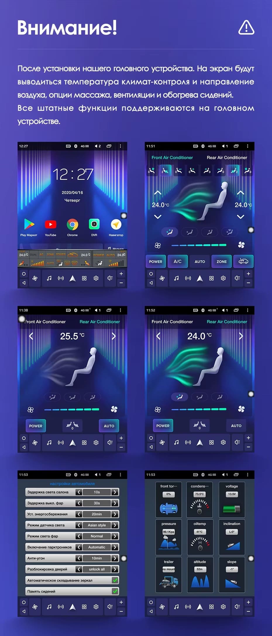 - Понятный и точный контроль за рабочими параметрами автомобиля (давление в шинах, топливо, масло).