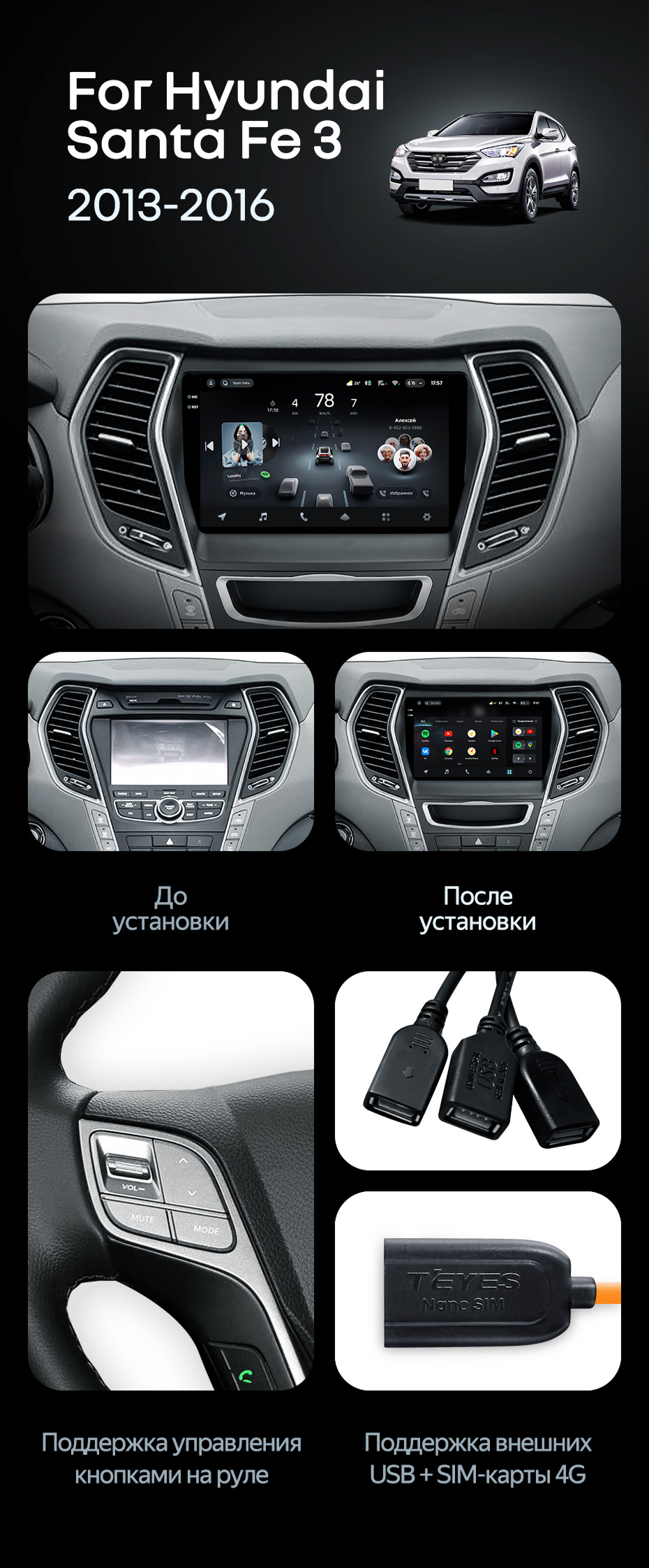 Штатная магнитола Teyes CC4 Pro 8/128 Hyundai Santa Fe 3 (2013-2016) Тип-B - купить всего за 58 900 руб. в интернет-магазине в Новороссийске Teyes.com.ru. ✓ Самый лучший выбор мультимедиа ✓ Лучшая замена штатному ГУ ✓ Тел. +7 (800) 775-31-74