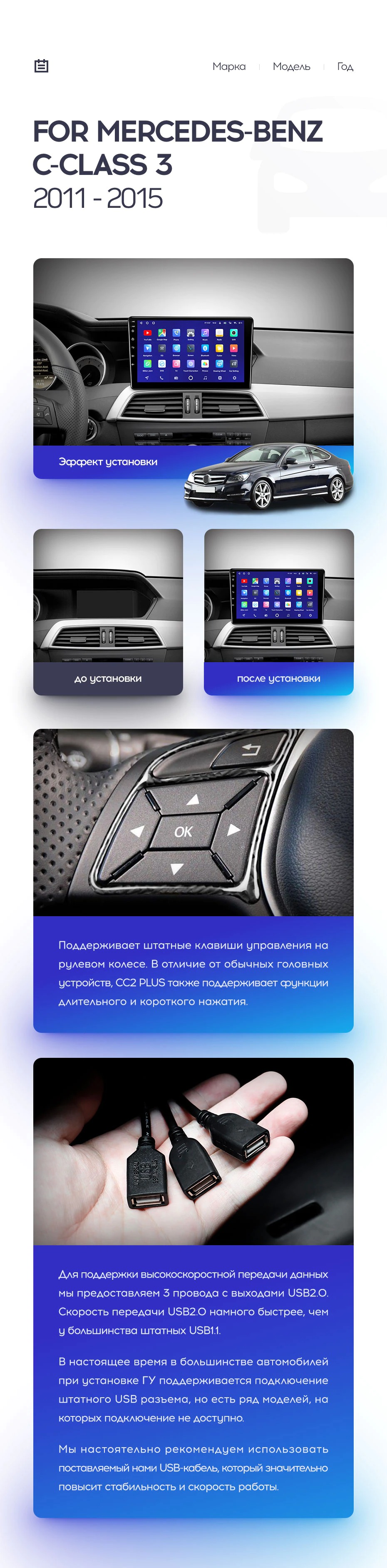 Установочный комплект для Mercedes-Benz C-Class W204 C204 S204 (2011-2015) включает переходную рамку и проводку.