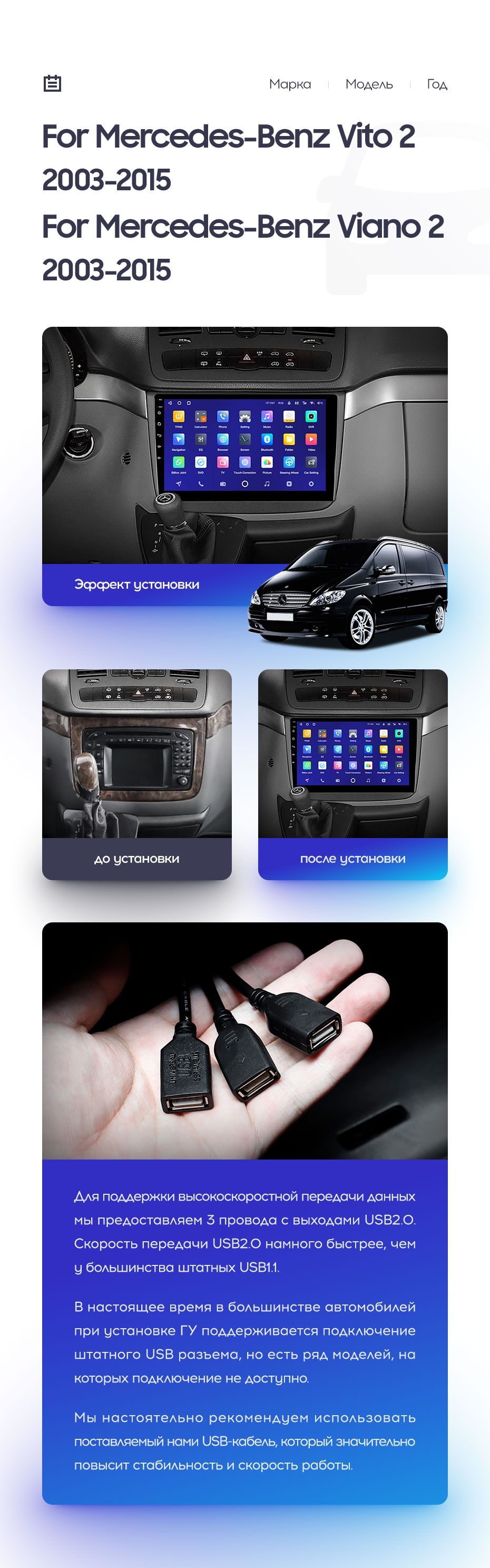 Полный комплект установки магнитолы Teyes с рамкой и проводкой можно выбрать в каталоге штатных магнитол Mercedes-Benz Vito W639 (2010-2015).