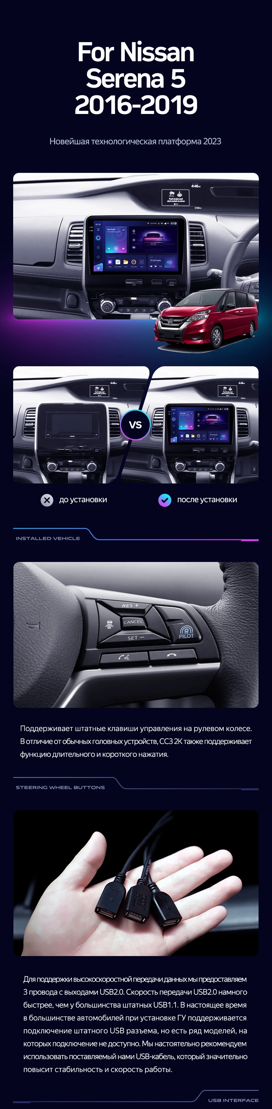 Полный комплект установки магнитолы Teyes с рамкой и проводкой можно выбрать в каталоге штатных магнитол Nissan Serena 5 C27 (2016-2019).