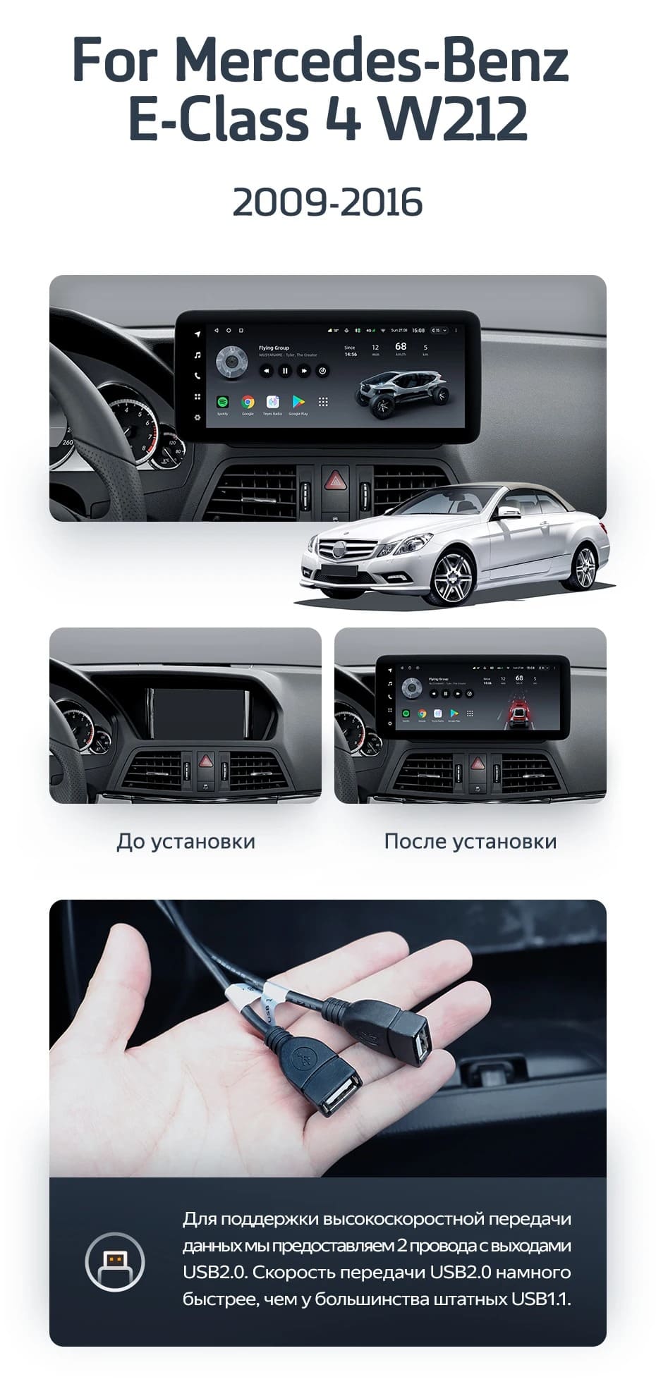 Установочный комплект для Mercedes-Benz E-Class 4 W212 S207 A207 S212 C207 (NTG 4.5) (2013-2016) включает переходную рамку и проводку.